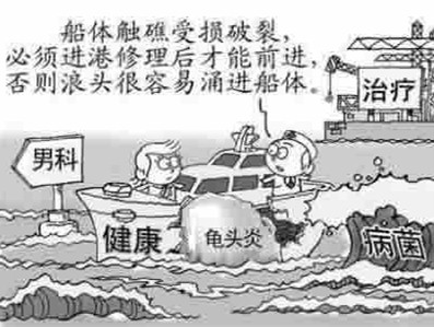 2、环状糜烂性龟头炎:龟头及包皮炎症伤口表现为环状,环状处产生乳酪状包皮垢,时间久了形成浅溃疡,若无该特征则容易与浅表性龟头炎混淆,不易分别。本病可单独存在,也可出现综合性症状。